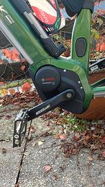 Telaio in alluminio 6061 con ruote da 27,5 Plus, motore Bosch Performance CX da 75 Nm di coppia, batteria integrata da 500 Wh, trasmissione a 9 rapporti con cambio Shimano Deore, forcella Suntour XCR con blocco e freni a disco idraulici Shimano BL-M315 180/160 mm.
