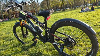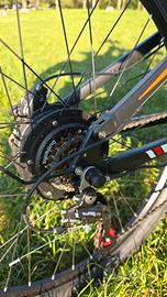 Vendo MTB 27.5" usata davvero poco in ottimo stato e manutenzione sempre fatta. La bici è stata usata per lo più da "Touring" in strade asfaltate a parte qualche giro al parco. ottima scelta per qualsiasi uso, la bici si comporta bene in tutte le situazioni e su qualsiasi pendenza (in base alla mia esperienza) . Ha 168km circa con 2 cicli di ricerca completa, ho fatto circa 80 km con l'ultima in strade urbane a velocità massima. la carica dura circa 8 ore se scaricata a circa 2 tacche su 10. Ha 5 livelli di velocità ed è sbloccabile velocità fino a 45km/h dal menù per sfruttare tutta la potenza motore da 1000 WATT . ha un faro anteriore e uno stop posteriore. VENDO CON ACCESSORI + PRODOTTI PER MANUTENZIONE CATENA. CAVALLETTO VENDUTO A PARTE ( 50€)