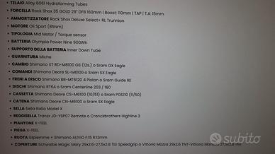 Vendo causa inutilizzo splendida E-bike Olympia. Usata veramente poco, in perfette condizioni, adatta per utilizzo sportivo e grintoso, per Trail, discese tecniche e lunghe escursioni in montagna Motore Oli sport da 900 wh garantisce una prestazione elevata e autonomia superiore Taglia M Nelle foto ci sono le specifiche tecniche Contattatemi pure per qualsiasi info !