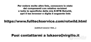 Vendo splendida e-bike da enduro, marca Rotwild modello RE750, perfettamente funzionante. Taglia M, Mullet (29/27,5”) per altezze da 1.68 fino a 1.80 . GARANZIA PERSONALE 1 ANNO SU CINGHIA, BATTERIA IN GARANZIA FINO A 03/27. Se vuoi conoscere tutte le specifiche di questa e-bike, vedi ultima foto (subito oscura i link). E-MTB stupenda da enduro ottima anche per all-mountain, escursioni generose (170/162,5mm) geometrie azzeccate, mullet (29/27,5”), maneggevole su tornantini stretti e tratti ripidi. Ottimo il motore Brose S-Mag da 90Nm (legale a 25kmh e 250W rating power) silenziosissimo e configurabile tramite app, capiente batteria da 750 Wh (nuova nel 2025) per dislivelli importanti sfiorando 3000 d+. Cinghia cambiata nel 2022 a 3500km, ulteriore ricambio in garanzia. Telaio full carbon areografato e personalizzato. Montaggio degno di nota con diversi componenti NUOVI freni Shimano Deore dischi da 203mm, trasmissione completa Shimano Deore a 12V, gomme Schwalbe al 100%, Mozzi Nanlio Xm820, Manubrio DXC (ancora da tagliare). Gli altri componenti usati, perf. funzionanti e revisionati sospensioni top gamma: forca RS Lyrik Ultimate Charger 2.1 Debonair 170mm, ammo RS Super Deluxe Air Ultimate upgrade MegNeg, telescopico RS Reverb Stealth 150mm, cerchi carbon Nextie Premium XM leggeri e rigidi con grafiche a richiamo. Ruote nastrate, latticizzate con inserti antiforatura PTN Rokkline. La bici mi ha accompagnato 5 anni, ottimo stato di conservazione, cadute praticamente assenti, presenta i classici segni di usura di chi va per sentieri: in particolare segni e scalfitture dovuti a pietrate e sfregamenti sui cerchi e nelle parti basse del telaio. Sempre shelterata e protetta, non presenta crepe, rotture o danni strutturali. Immacolati steli e telescopico. Accessori vari vedi foto. PREZZO: 2900€, QUALSIASI PROVA (ANCHE TEST SU SENTIERO) E CONSEGNA IN ZONA GENOVA-PEGLI, PAGAMENTO CONTANTI o BONIFICO IST. POSSO ANCHE SPEDIRE, PREZZO DA CONCORDARE A CARICO ACQUIRENTE.