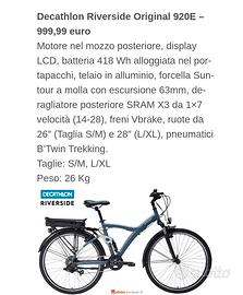 vendo ebike marca b-twin modello original 920-e solo 328 km taglia M ruote da 26 praticamente nuova vendo per passaggio a e-bike da enduro sostituiti gli pneumatici con modello con più grip michelin country stile regalo cameradaria nuove pagata 999 euro vendo a 650 non trattabili