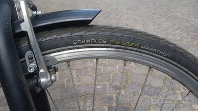 Vendesi per mancato utilizzo Elops 120e del 2024 Personalizzazioni (migliorie): _ attacco manubrio regolabile. _ comando marce: manopola girevole revoshift grip (antiscivolo anche in caso di pioggia). Manettino originale in omaggio. _ copertoni Schwalbe Marathon Eco (the green) Antiforatura come nuovi . Coppia di copertoni originali seminuovi in omaggio. _ protezione deragliatore . _ raggi ruota posteriore di tipo 13G (spessore 2,3mm). Raggi originali (tipo 14G - spessore 2mm) in omaggio. Vantaggi: _ ricambi economici (es: ruota posteriore 28", motore nel mozzo e doppia parete elops 120 a 169,9 euro) _ assistenza presso ogni negozio Decathlon e non solo Disponibilità scontrino di acquisto. Visibile in zona Piazza Ferrucci (Firenze) Astenersi perditempo Caratteristiche City bike a pedalata assistita elops 120e di Decathlon (disponibilità scontrino a riporova della legale proprietà) Telaio in acciaio "a collo di cigno" che facilita la salita in sella e una posizione di guida con la schiena ben dritta. Motore su mozzo della ruota posteriore, potenza di 250W e coppia massima di 35 Nm. Batteria agli ioni di litio Samsung da 36V (capacità di 313 Wh) 3 livelli di assistenza elettrica (Eco, Normal, Sport) fino a una velocità massima assistita di 25 km/h. Include anche una modalità "smart" che spinge la bici a piedi. Cambio a 6 velocità (deragliatore Microshift o Shimano Tourney a seconda della versione). Il peso totale della bicicletta, inclusa la batteria, è di circa 24,5 kg. Ruote e Freni: Ruote da 28 pollici (700c) con cerchi in alluminio a doppia parete. Il sistema frenante utilizza classici freni V-Brake. Illuminazione a LED integrata alimentata dalla batteria della bici (anteriore nel telaio, posteriore sul parafango). Cavalletto laterale, parafanghi, carter copricatena e portapacchi posteriore (portata max 27 kg). Sella larga in schiuma e manubrio in stile olandese per una guida confortevole in città. La bici supporta un carico massimo totale di 100 k