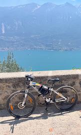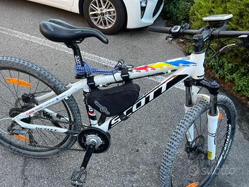 Mtb Scott trasformata in ebike con kit Tongsheng Tsdz taglia S. Forcella ammortizzata anteriore. Freni a disco. La batteria è da sistituire (si trova facilmente in internet). Caricabatteria incluso. Mtb leggera che sí può facilmente trasportare con i tradizionali porta bici sul tetto.