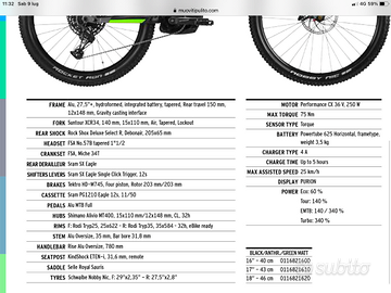 cerchio anteriore 29" posteriore 27,5", gomme nuove con salsicciotti e liquido antiforatura, sellino telescopico., manubrio con appendici, borsa portacellulare da telaio impermeabile, porta borraccia, luci anteriore e posteriore