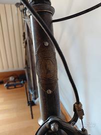 DESCRIZIONE Come da annuncio: cedo bellissima corsaiola plongée aa10 Marca "Cycles FEMINA". Vista l'inclinazione in avanti del telaio forse inizialmente da Pista. Marchio fondato a Augerolles nel 1909 in Francia. La bici come da ritrovamento è stata smontata, pulita e rimontata. Attuato restauro conservativo. Telaio doppio diapason con segni del tempo e ancora tracce del suo colore. La bici per il suo stato di conservazione e i dettagli, parla da sola. Il telaio è munito di fregio ottonato sul canotto frontale con sovraimpresso la marca della bici. Fascette passa cavi di cui uno a forma di scudo dove è impresso/ punzonato il nome del proprietario. Bellissima forcella simil Peugeot/ Alcyon con manubrio corsaiolo con manopole in legno rifatte. Cerchi da 28 1/2 con copertoni e camere d'aria nuove. Mozzi originali, di cui il posteriore giroruota Diamant munito di oliatore e bellissimi tendicatena. Il mozzo anteriore munito di galletti epoca nichelati . Freni a mensola fascettati. Sella originale marca DARMA in cuoio. Nikelature e parti bianche ancora in eccellenti condizioni. Movimento centrale con guarnitura originale/ corona passo Humber, idem la ruota libera. Pedali a sega, di cui uno saldato come da ritrovamento che non pregiudica la bici. Oggetto da collezione, si vende esattamente come da foto, quali parte integrante della descrizione, vendita tra privati, vale la formula visto e piaciuto, nessuna garanzia. Solo contatto email di subito. Ritiro a mano a TV oppure UD. Disponibile x altre foto dopo contatto. Massima serietà, no problematici e affaristi del settore. PREZZO richiesto 700€ Grazie Furio Tag corsa anni 10 pista epoca corsaiola giroruota passo Humber epoca vecchia Peugeot Alcyon Terrot Diamant Bianchi path racer primi 900