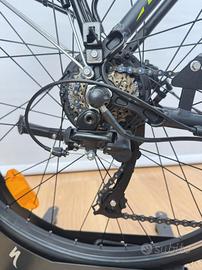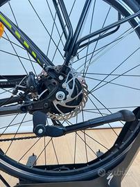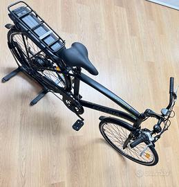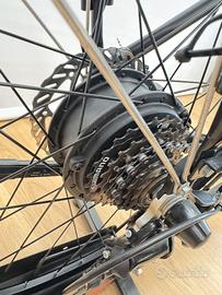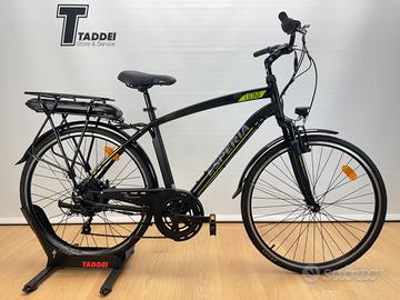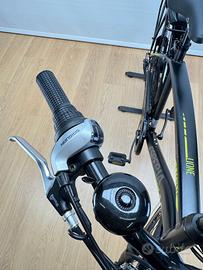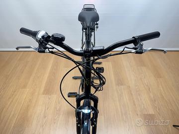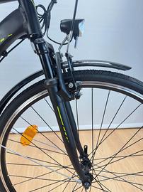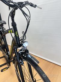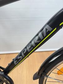 Esperia Lione City Bike Urban elettrica con ruote da 28 pollici, usata molto poco come si può vedere dalle foto. Motore alla ruota posteriore da 250W con batteria integrata al portapacchi da 468Wh per un autonomia di circa 60km, 4 livelli di assistenza con cambio a 6 velocità. Telaio in alluminio Esperia con luci integrate alla batteria della bici, si accendo in contemporanea con il motore, la bici ideale per gli spostamenti in città.
