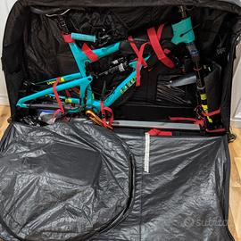 La Bike Bag Pro di Evoc è una borsa spaziosa e robusta per la vostra bicicletta in viaggio. La borsa offre spazio per quasi tutte le biciclette fino a 29". Per evitare che la bicicletta si graffi o si danneggi, le ruote vengono riposte in una borsa aggiuntiva, dotata anche di una protezione extra per i dischi. Per evitare che il viaggio attraverso l'aeroporto si trasformi in una misera fatica, la borsa è dotata di ruote.