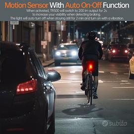 【Sensore di movimento integrato per il rilevamento dei freni e la funzione di spegnimento automatico】Quando attivata, la luce passerà a 200 lumen in uscita per 2 secondi per aumentare la visibilità quando rileva la frenata. Quando la potenza è bassa, il fanale posteriore passerà automaticamente alla modalità di risparmio energetico (5 lumen) per prolungare la durata della batteria e contemporaneamente verrà disattivata anche la funzione di rilevamento del freno.