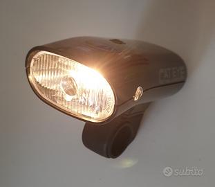 Faretto anteriore per bici MTB o Touring, marca CATAYE mod. HL 500. Lampada alogena. Funziona con 2 batterie tipo LR14 da 1 4 volt ( non comprese).Possibilità di sganciarla dal collarino fisso in bici e portarla con se. Accensione tramite leva posta sul retro (vedi foto n.5). Ottimo stato pari al nuovo. Posso spedire.