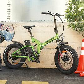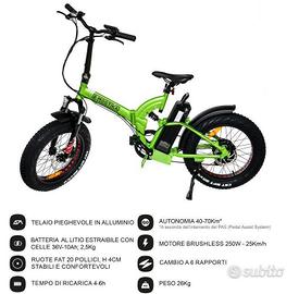 E-Mootika mini fat e-bike è perfetta per terreni offroad e percorsi sterrati. Grazie alle ruote larghe è in grado di sfrecciare anche sulla sabbia. Grazie al sistema a 5 livelli di pedalata assistita e al cambio 6 rapporti, ogni viaggio sarà comodo e senza fatica. Il telaio in alluminio pieghevole permette di riporre la bicicletta in poco spazio, per portarla anche in auto o in treno. La batteria da 36 V garantisce un'autonomia di 1,5-3 ore e si ricarica in 4-6 ore. Freni a disco e motore brushless completano le dotazioni che consentono alla mini fat bike di raggiungere i 25 km/h con la massima sicurezza. Dimensione ruote 20 pollici. Misure bici da piegata: larghezza 51 cm, lunghezza 103 cm, altezza 75 cm.