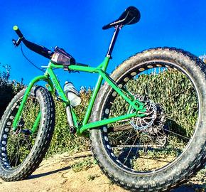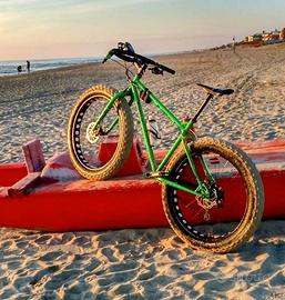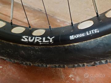 Fatbike Surly Pugsley con manubrio Jones davvero ottimo, leve Paul Components e serie sterzo Chris King, Sella Tune, Cerchi Surly Merge LT, gomme Surly Larry 3,8 (può montare fino a 4"), sgangi rapido Carbon-Ti, freni meccanici Avid BB7.