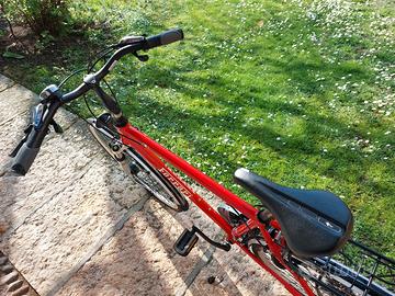 Colore rosso, livrea Ferrari, unisex adulto, cambio Shimano Acera 3x8, telaio realizzato a mano in alluminio, luce rossa a batteria sul posteriore, luce anteriore bianca, campanello, portapacchi con clip a molla.