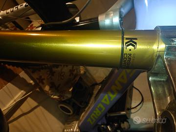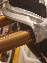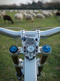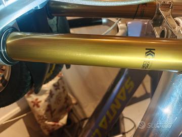 forcella fox 40 29 2023 è stata pellicolata e revisionata recentemente ,lo stelo della forcella c'e un piccolo graffio.la forcella è stata riverniciata per abbinarla al colore della bici, e la piastra è stata lucidata. Durante l’ultima manutenzione, poiché non è stato utilizzato un sealing kit originale, sul destra c’è una leggera perdita d’olio; tuttavia il funzionamento è completamente normale. Si consiglia di sostituirlo con un sealing kit SKF.