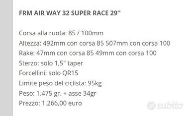 vendo forcella Frm da 29 in carbonio gli steli e in scandium il canotto, completamente regolabile con perno passante incluso da 15 peso 1400 g in ottime condizioni
