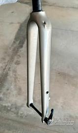 Forcella anteriore mtb strada gravel rigida in carbonio originale Bianchi, smontata da una impulso e-allroad gravel. Mozzo flat (non conico) 1 1/8 Passo 12x100 completa di perno passante originale come da foto. Dimensioni pneumatico 28’’ fino a 50mm 700x45 1,9x622. La lunghezza dalla base del cuscinetto dello sterzo al mozzo passaruota è di 397mm (39,7cm). Come si puo vedere dalle foto la forcella è stata rivestita di pellicole in modo da non prendere graffi, vi arrivera quindi esattamente come nuova. Passaggio cavi interno, supporto per freno a disco flat mount standard. Colore grigio metallizzato.