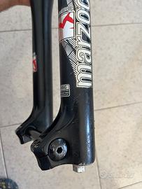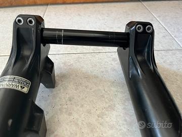 Vendo forcella doppia piastra Marzocchi bomber 888 RC3 Evo in ottimo stato. Sicuramente per ruota da 26", da verificare se possa ammettere anche una ruota da 27.5". E' la versione con camera molla in uno stelo, e camera aria-olio nell'altro stelo, che presenta le seguenti regolazioni: precarico molla, compressione alte velocità, compressione bassa velocità (variazione rapporto volume aria-olio), rebound. Perfettamente funzionante, revisione totale (meccanico autorizzato Andreani) a fine estate 2024 ed utilizzato una sola volta questa estate. Escursione 200 mm. Lunghezza taglio canotto sterzo 190 mm. Gli steli non presentano alcun graffio evidente. I foderi presentano qualche graffio superficiale da normale uso downhill. Seconda molla a rigidezza maggiorata inclusa. A disposizione per ulteriori foto. No perditempo. Downhill, dh, forcella, Marzocchi, 888, bomber