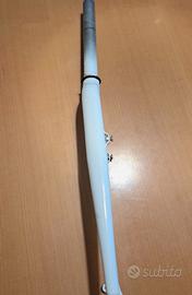Vendo forcella bici in acciaio, color bianco, per ruote da 28", per freni tradizionali e v-brake, disponibile portapacchi, lunghezza cannotto 220 mm, passaggio gomma 50 mm a 25 euro.