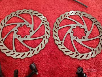 Come da titolo vendo coppia pinze per freno a disco meccanico flat mount Promax Decode R, doppio pistoncino, sono montate pastiglie nuove semi metalliche Quaxar (solo rodate), coppia dischi promax 6 fori D.160 , due spezzoni nuovi di guaina anti compressione jagwire 1500 + 700 mm