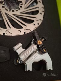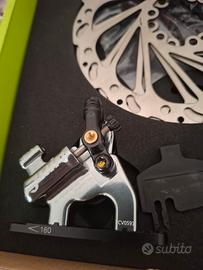 Sono freni a disco ibridi con azionamento a cavo e pistoncino idraulico.