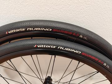 Coppia di ruote alluminio Fulcrum 600 DB, per freni a disco. Complete di copertoncini Vittoria Rubino Graphene 2.0 da 28 mm e camere d'aria . I cerchi sono già nastrati per eventuale montaggio tubeless. Le ruote hanno circa 1500 km, le camere le ho messe nuove. Tolte da bici da poco acquistata, le vendo per passaggio al carbonio. Canale interno da 20 mm. Altezza 25 mm. Peso 1,7 kg. Corpetto Shimano 12 V. Comunque molto scorrevoli. Spedizione con corriere a mio carico.