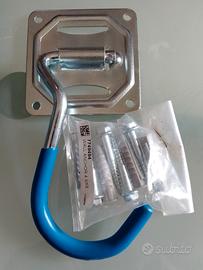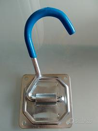 Gancio robusto per appendere la bicicletta al muro. La base quadrata garantisce stabilità. - Gancio con rivestimento blu. - Base in metallo con fori per il fissaggio. - Tasselli e viti per i fissaggio