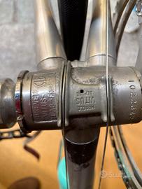 Bicicletta corsa d’epoca in alluminio. Telaio in perfette condizioni Adatta anche per Eroica Allestimonto Campagnolo (cambio Nuovo Record, pinze freni, tubo sella, mozzi). ruote con tubolari nuovi. 6 rapporti al cambio, moltipliche 52/47 , misure 56 cm verticale, 56 cm orizzontale. Altre foto a richiesta. Prezzo leggermente trattabile Non spedisco