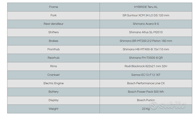 Caratteristiche principali: mountain bike elettrica (bici a pedalata assistita) Ghost Teru; freni a disco idraulici Shimano, cambio Shimano Altus (9 velocità) e motore Bosch Performance Line CX con 4 livelli d'assistenza (eco, tour, sport e turbo) e batteria Bosch Power Pack 500 Wh
