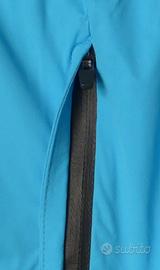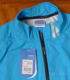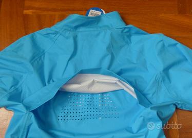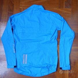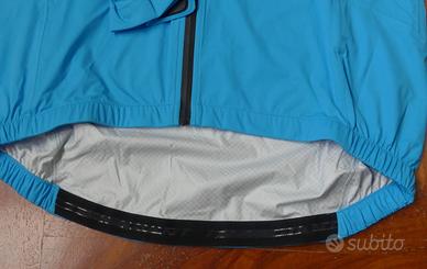 Giacca antipioggia Giant Rain Jacket, taglia M, nuova con etichetta, colore azzurro, tessuto ProTextura 74% poliestere e 26% poliuretano impermeabile e allo stesso tempo traspirante, fantastico al tatto, zip anteriore completa a tenuta impermeabile, patta di protezione interna e sede superiore antipizzicatura del collo, tasca anteriore lato sinistro con zip impermeabile, tenuta inferiore elastica con inserti in silicone antiscivolamento nella sezione posteriore, maniche con chiusura terminale a fascia con velcro, doppia protezione superiore sulla schiena con tessuto interno microforato per ulteriore dissipazione del sudore, bande riflettenti posteriori e sul colletto anteriormente, logo Giant riflettente sulla manica sinistra.