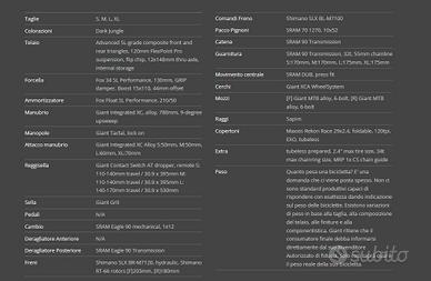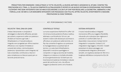 ++ IMPORTANTE! LE RISPOSTE ALLE VS. DOMANDE VENGONO RECAPITATE DIRETTAMENTE NELLA VS. CASELLA EMAIL E NON NELLA MESSAGGISTICA SUBITO ++ **ATTIVO PAGAMENTO DILAZIONATO CON HEYLIGHT DA 100 A 5000 EURO FINO A 36 MESI SENZA DOCUMENTO DI REDDITO** PRODOTTO NUOVO! GARANZIA UFFICIALE! GIANT ANTHEM ADVANCED SL 2 MY26 UN MISSILE PER L'XC PIU COMPETITIVO LA ANTHEM E' TUTTA NUOVA - PIU LEGGERA - PIU EFFICIENTE - PIU BELLA TELAIO IN CARBONIO SL GRADE GARANTITO A VITA - ESCURSIONE 120 MM FORCELLA ROCK SHOX SID SELECT+ 3P CHARGER REMOTE LOCKOUT AMMORTIZZATORE ROCK SHOX SIDLUXE SELECT+ REMOTE CONTROL TRASMISSIONE SRAM EAGLE 90 T-TYPE 12 SPEED MANUBRIO GIANT XC INTEGRATED COMPOSITE RUOTE GIANT XCA 29" TUBELESS READY TUTTI I DETTAGLI NELLA SCHEDA ALLEGATA LINK DIRETTO: https://www.vianellibikes.com/Product/11619/giant-anthem-advanced-sl-2 VISIONATE IL NOSTRO SITO INTERNET PER ULTERIORI DETTAGLI, DISPONIBILITA', INFORMAZIONI E ACQUISTO DIRETTO. DISPONIBILI PAGAMENTI PERSONALIZZATI - FINANZIAMENTI - PAGAMENTO CON HEYLIGHT SENZA DOCUMENTO DI REDDITO PER IMPORTI DA 100 A 5000 EURO TUTTE LE SPECIFICHE NELLA SCHEDA ALLEGATA PER DISPONIBILITA'/INFORMAZIONI CONTATTECI TRAMITE SUBITO.IT O DIRETTAMENTE DAL NS. PORTALE VIANELLIBIKES.COM NON SI GESTISCONO RICHIESTE VIA TELEFONO - UTILIZZATE LA CHAT O IL MODULO DI CONTATTO DAL NS. PORTALE E RISPONDERA' IL PRIMO OPERATORE COMPETENTE - GRAZIE **PROMOEBIKENUOVE** CODICE 110143 ++ IMPORTANTE! LE RISPOSTE ALLE VS. DOMANDE VENGONO RECAPITATE DIRETTAMENTE NELLA VS. CASELLA EMAIL E NON NELLA MESSAGGISTICA SUBITO ++