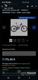 Come da titolo vendo un MTB GIANT da 29" pollici in carbonio. Comprata 1 anno fa da un mio amico il quale non ci ha mai fatto sterrato per motivi fisici ed io non l'ho mai usata. Non me ne intendo di bici per cui ho allegato la foto del modello così puoi cercare le caratteristiche tecniche. Solo consegna a mano.