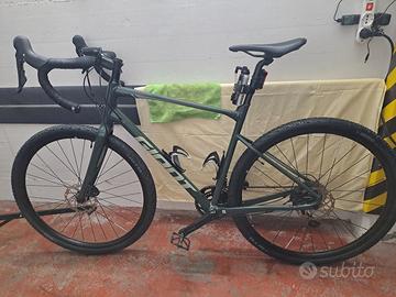 vendo come da foto per passaggio a modello superiore bici gravel giant revolt 2 tg L per altezze da 179 cm a 191 cm con gruppo di trasmissione e guarnitura aggiornati a shimano GRX 2x10 velocità cassetta 11x36 con attacco manubrio sostituito con redshift ammortizzato per migliorare il comfort su sterrato. Tenuta maniacalmente e con pneumatici nuovi. Normali segni di usura.