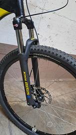monocorona 9 velocità corona 32T , cassetta pignoni Shimano 11/41, guarnitura e catena nuovi di zecca, freni Shimano MT-200 idraulici nuovi di zecca, forcella 29" Suntour con comando di blocco al manubrio, manubrio oversize 72cm, attacco 80mm.
