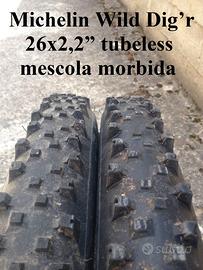 - coppia di pneumatici Michelin Wild Dig’r 26x2,2” tubeless mescola morbida per terreni fangosi. Hanno un eccellente grip ,un alta capacità di auto pulizia e una frenata molto efficace. Spalla rinforzata anti pizzicamento, architettura e mescole specifiche per il Downhill. MotoCross compound. Sono state usate pochissimo ma, come si vede in foto, sono stati tagliati di poco (di piu per la posteriore) i tacchetti centrali per aumentare la scorrevolezza (prassi comune per questo tipo di gomme). 31€ la coppia.