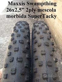 -coppia di gomme Maxxis Swampthing 26x2,5” doppia carcassa 2ply mescola morbida SuperTacky seminuove, usate per un paio di discese di prova. Adattissima a terreno compatto e imbattibile su terreno polveroso o umido. 37€ la coppia.