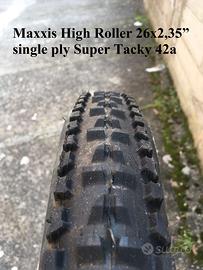 - gomma Maxxis High Roller 26x2,35” single ply Super Tacky 42a, mescola morbida con un ottimo grip. L’ho acquistata ma poi sono passato alle 2,5”. Pesa 840 grammi circa. Gomma perfetta per uso enduro. 34€.