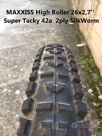 -gomma Maxxis High Roller 26x2,7” Super Tacky 42a 2 ply doppia carcassa UST tubeless edizione limitata SilkWorm, un particolare materiale utilizzato solo in alcune versioni per aumentare la resistenza alle forature e agli strappi. Gomma introvabile!! L’ho acquistata ma sto girando poco e quindi non l’ho più montata. Pesa 1400 grammi circa. 42€.