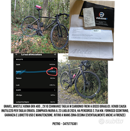 Gravel_Whistle Kiowa GRX 400 _ 2X10 (shimano) taglia M carbonio freni a disco idraulici. Vendo causa inutilizzo per taglia errata. Comprata Nuova il 23 Luglio 2024, ha percorso 2.754 km. Fornisco scontrino, garanzia e libretto uso e manutenzione.