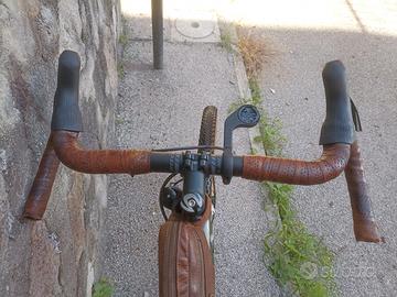 Ottime condizioni e personalizzata con manubrio Ritchey Beacon, nastro manubrio, borsetta telaio, borsetta sella, paracatena e supporti gonfiatore in vera pelle, catena oro, supporto garmin e portaborraccia, adesivi personalizzati in stile vintage tipo cacciabombardieri 2 guerra mondiale, gomme nuove Continental trail. Pedali Shimano XT inclusi,