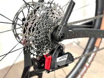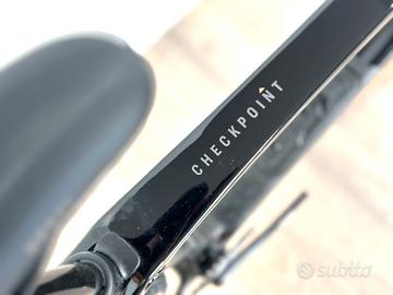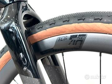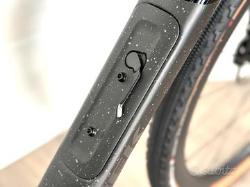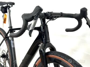 Bici gravel con telaio in carbonio adatta al bikepacking, predisposizione attacchi borse bici, passaggio ruote generoso.
