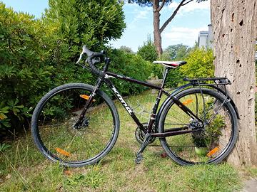 La bicicletta classica per il cicloturismo: KONA Sutra, cambio Shimano CLOSE, freni a disco, ruote 28" WTB, taglia 46, completa di parafango anteriore e posteriore (montato) e portapacchi per borse laterali, colore viola melanzana metallizzato.