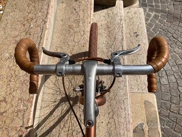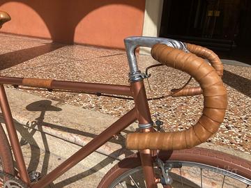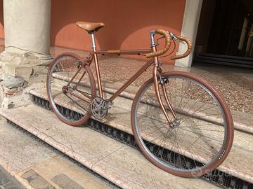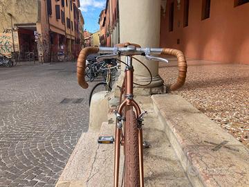 Splendida Gravel singlespeed appena assemblata, in un unico e brillante colore copper metallizzato. tutti i colori sono giocati sulle tonalità rame e marrone per un design unico. Dotata di ruote oversize 28" fino a 48c, ideali per ogni terreno, da quello urbano a quello sterrato. Sella e nastri in vera pelle per il massimo del comfort e dello stile. Perfetta per chi cerca una bici elegante e performante per la città e non solo. un'oggetto che non passa certo inosservato. (La bici è facilmente aggiornabile per uso gravel marce, prezzo da concordare.) Visibile Bologna centro storico, spedisco in tutta italia.
