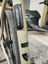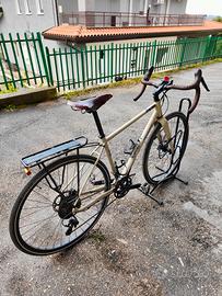 Telaio in acciaio taglia 54 con forcella in carbonio, cambio 11v Shimano 105 con doppia corona 48/32 e pacco pignoni 11/36, sella Brooks b17 imperial più l'originale, portaborse anteriori in alluminio BRN, portapacchi posteriore Specialized Elite, pneumatici seminuovi Schwalbe gt 365 antiforatura, pasticche dei freni nuove. Con questa gravel ho viaggiato in mezza Europa carico come un mulo (bici + bagagli 50 kg) senza mai un problema. La bici ha dei normali segni di usura dovuti all'utilizzo, se cercate una bicicletta immacolata questa non fa per voi. Non spedisco, prezzo poco trattabile.
