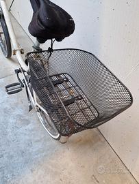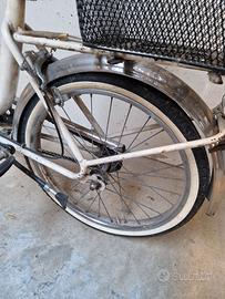Graziella bianca. Sono stati cambiati i Freni,il Manubrio e la ruota Posteriore.Bisogna cambiare la ruota Anteriore.Compreso c'è il Portapacchi Decathlon