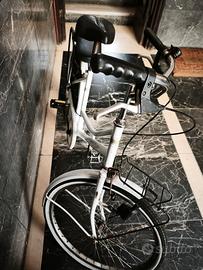 Nelle foto vedi tutto: telaio bianco lucido (senza canna per comodità femminile), ruote da circa 20" con gomme in buono stato, sella nera comoda, luce funzionante, portapacchi con rete, , parafango ok – si piega alla grande per salire in auto o riporre facile.