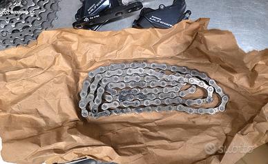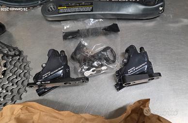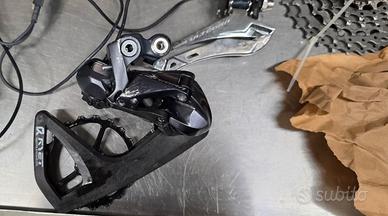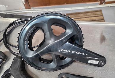 Vendo gruppo completo Shimano 11v Elettronico, lunghezza pedivella 172.5 ,corone anteriore 50/34, pacco pignoni durace 11-34 e catena ultegra (cerate) hanno fatto massimo 600 km. Puleggia Ryet ceramica. Fornisco anche puleggia originale. Il misuratore di potenza non è funzionante (si accende il led di una sola pedivella su 2). Il gruppo funziona perfettamente.