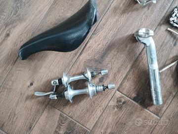 gruppo completo ( mancante solo movimento centrale) prezzo per tutto il gruppo o singoli componenti come di seguito: sella concor euro 35 manettini chorus c record euro 45 guarnitura mm170 moltipliche campagnolo 52/42 euro 70 cambio 1 Serie euro 60 pinze euro 50 mozzi 25 reggiseno 27.2 euro 35 catena euro 25 pedali euro 60 deragliatore anteriore 15 ss euro 40 set manubrio 50
