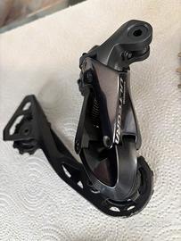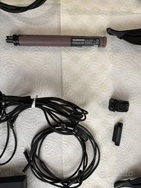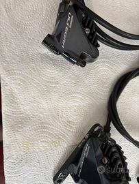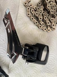 Gruppo Shimano Ultegra di2 11v composto da: 1) Trasmissione 11V semi-nuova con soli 900 Km percorsi (corone 52-36, catena KMC X11SL, Cassetta 11-34) 2) Pedivelle destra e sinistra 3) Deragliatori anteriore 4) Dergliatore posteriore direct mount e a gabbia lunga (la gabbia lunga ne permette l’utilizzo anche con pignoni maggiori di 30 denti) 5) Leve destra e sinistra 6) Batteria e carica batteria 7) Centralina e cablaggi 8) Freni idraulici con pastiglie 9) Modulo accessorio Shimano D-Fly (non presente di serie nel gruppo) per collegamento wireless del cambio alla APP dello smarphone e/o al Garmin o altri ciclocomputer compatibili.