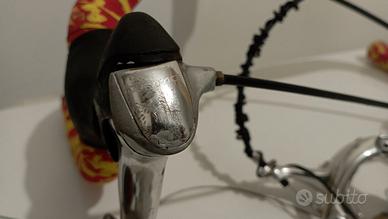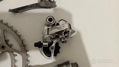Gruppo Shimano Dura ace 7701 usato e con segni di utilizzo, zone opacizzate, graffiate e scolorite, come visibile in foto.