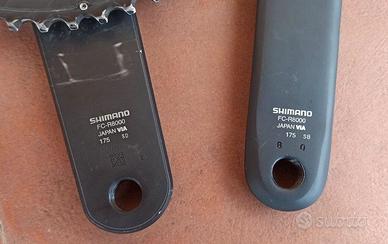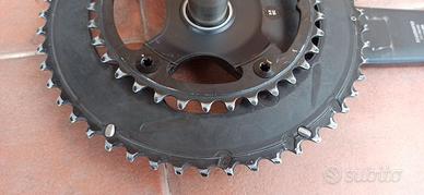 Guarnitura completa in ottime condizioni, corone 50/34 e pedivelle da 175mm, presente qualche inevitabile segno d’uso. Disponibile anche con pedivelle da 172,5mm (non presente in foto). Tutte le filettature (asse, pedivella e pedali) sono in perfetto stato d’uso, esenti da difetti. Non sono in grado di stabilirne il chilometraggio. Altre foto a disposizione.