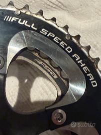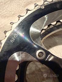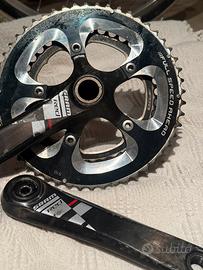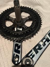 guarnitura SRAM Red per bicicletta da corsa, probabilmente un modello con perno BB30 o precedente all'attuale standard DUB. Componente: Guarnitura stradale con pedivelle in carbonio. Marca: SRAM. Modello: Red (serie "Gram" o simili basato sul testo visibile). Rapporti: Corone da 52/38 denti (indicazione 52/38 visibile sulla corona grande).